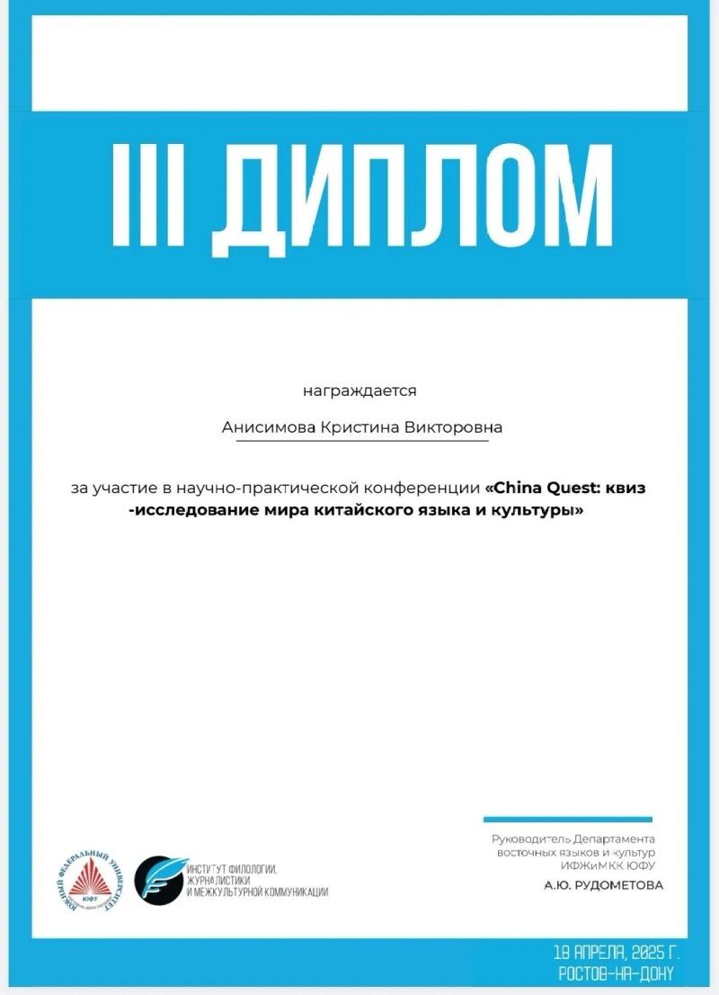 - Ростовский Государственный Экономический Университет (РИНХ),Факультет Лингвистики и Журналистики Зарубежное регионоведение (Восточная Азия) (с 2023 г.).