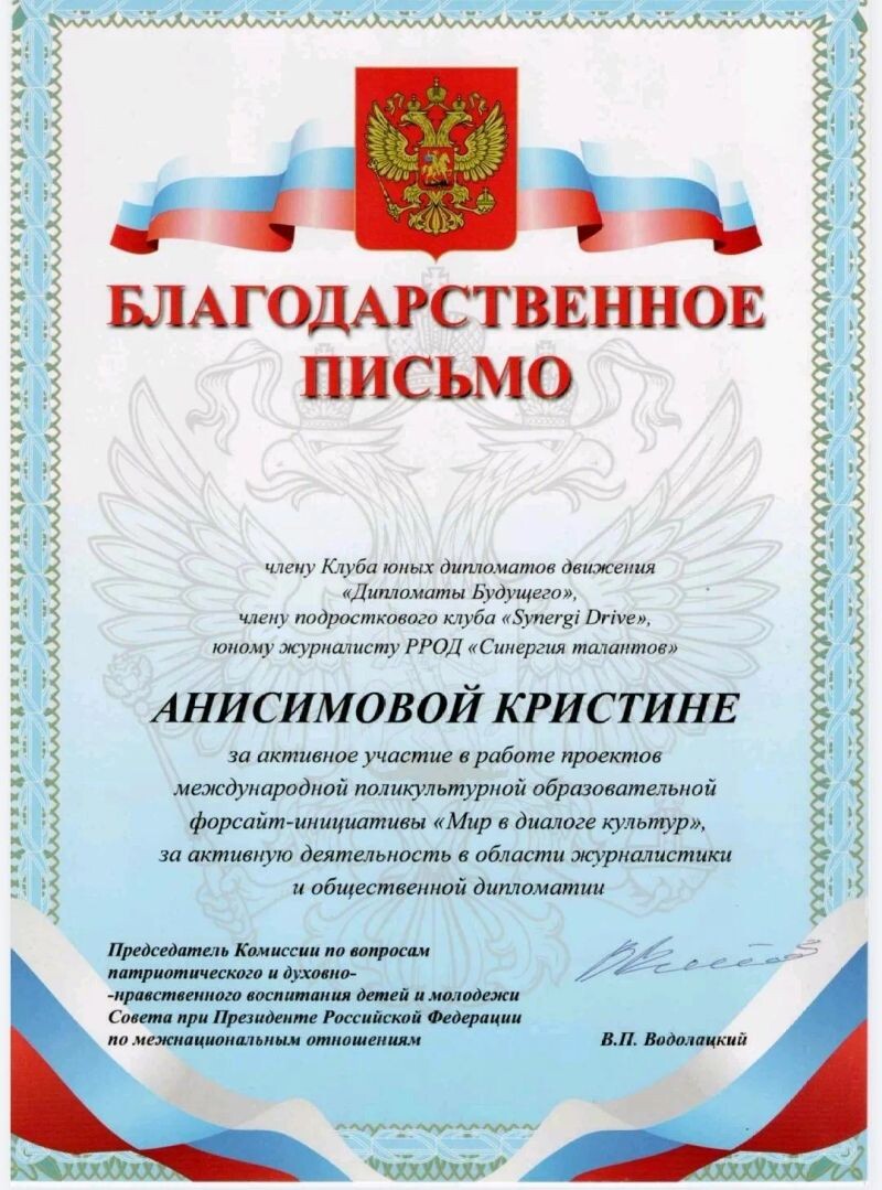 - За активную деятельность в работе проектов международной поликультурной образовательной Форсайт-инициативы «Мир в диалоге культур» (с 2024 г.).