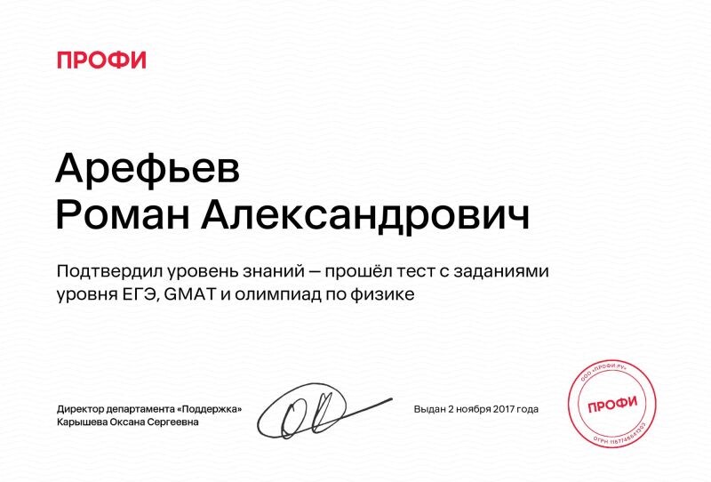 Роман Александрович - преподаватель высочайшего уровня. Моя дочь занималась у него физикой весь 10 класс. Ей очень нравится, она делает большие успехи. Мы планируем продолжить занятия с Романом Александровичем и готовиться к ЕГЭ.