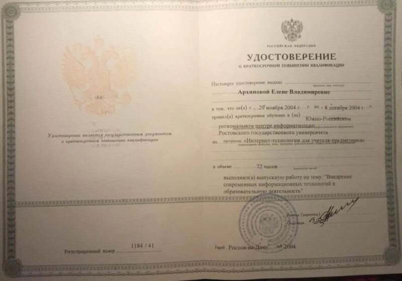 - Южно-Российский региональный центр информатизации Ростовского государственного университета, интернет-технологии для учителя-предметника, 2004 г.
