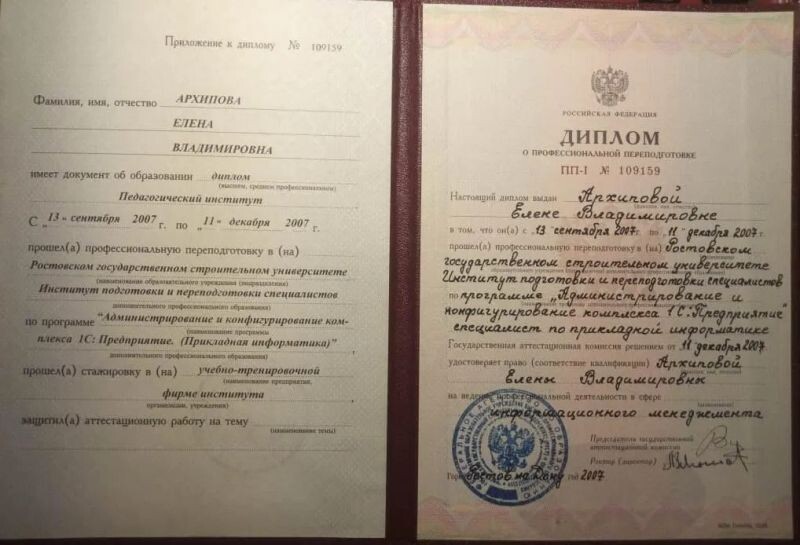 - Ростовский государственный строительный университет, Институт подготовки и переподготовки специалистов, программа «Администрирование и конфигурирование комплекса 1С: Предприятие», специалист по прикладной информатике, 2007 г.