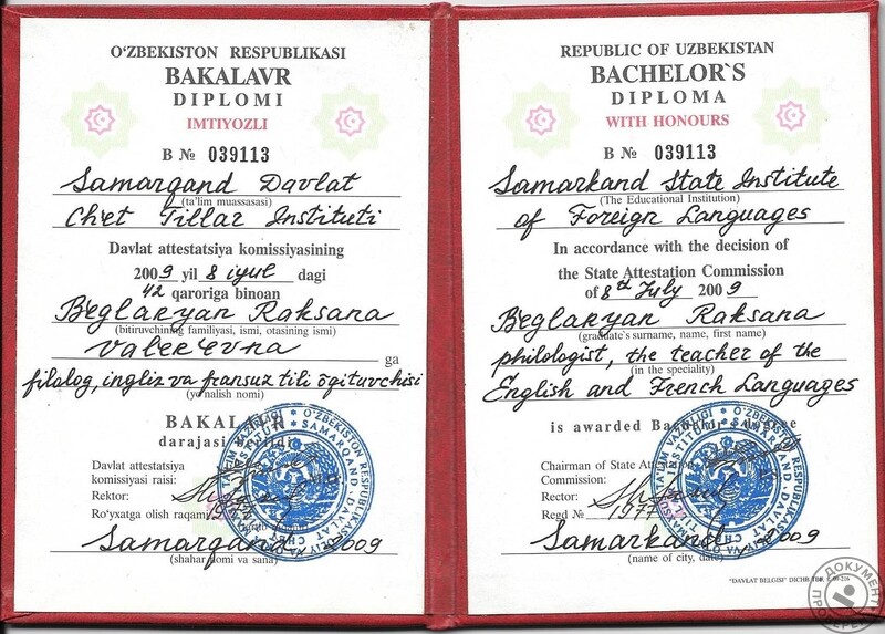 - Самаркандский государственный институт иностранных языков, факультет английского языка, специальность – филолог, преподаватель английского и французского языков, 2005–2009 гг.