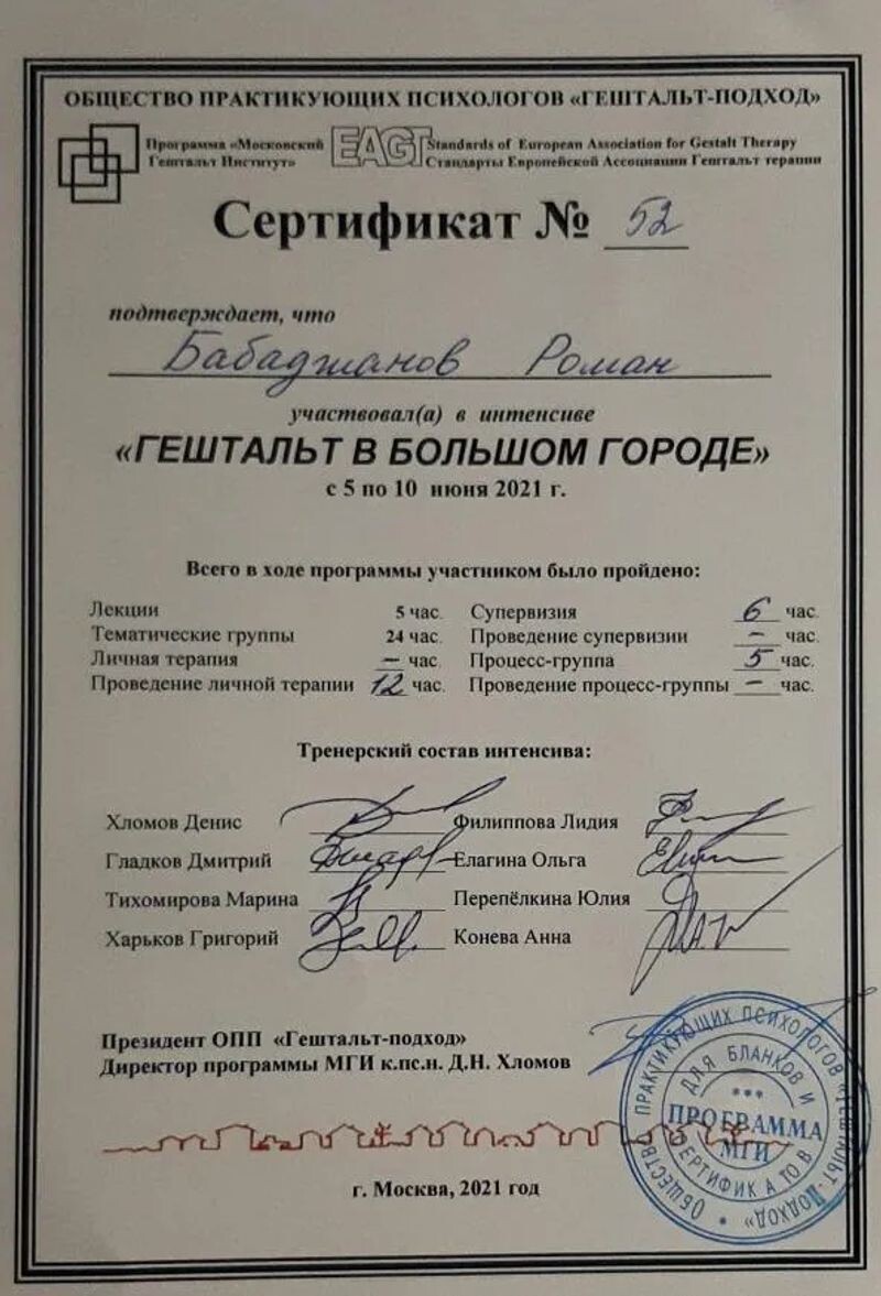 - Общество практикующих психологов «Гештальт-подход», интенсив «Гештальт в большом городе», 2021 г.