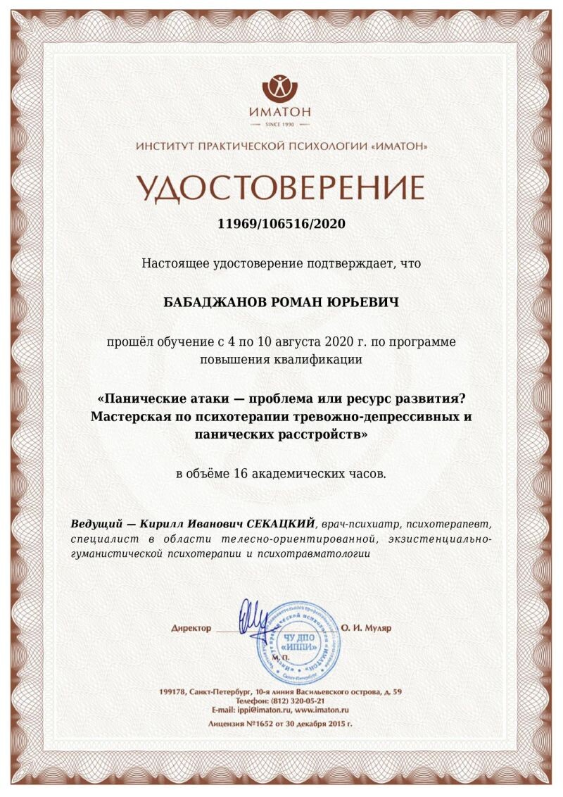 - Иматон, программа «Панические атаки – проблема или ресурс? Мастерская по психотерапии тревожно-депрессивных и панических расстройств», 2020 г.