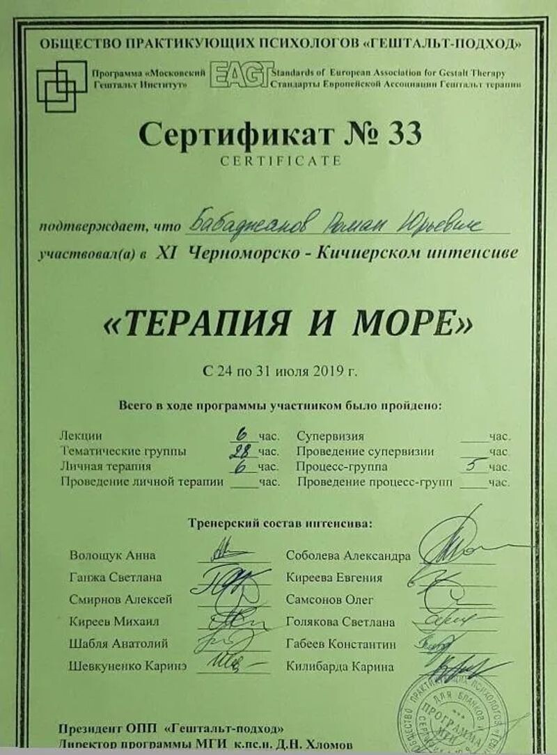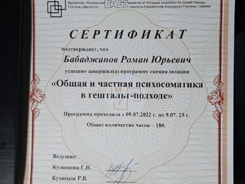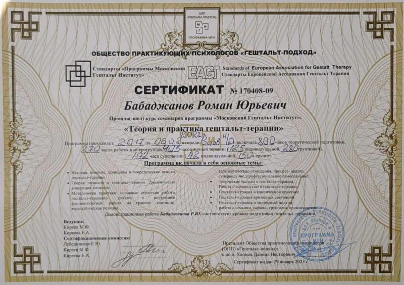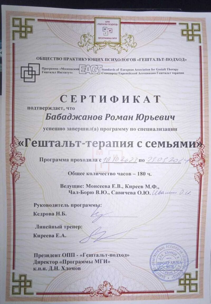 - ОПП «Гештальт-подход», программа МГИ «Гештальт-терапия с семьями», 2023–2024 гг.