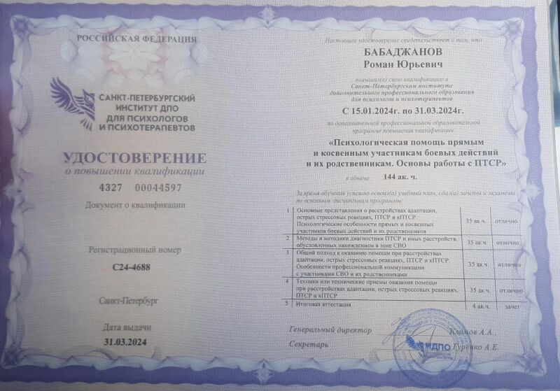 - Санкт-Петербургский институт ДПО для психологов и психотерапевтов, программа «Психологическая помощь прямым и косвенным участникам боевых действий и их родственникам. Основы работы с ПТСР», 2024 г.