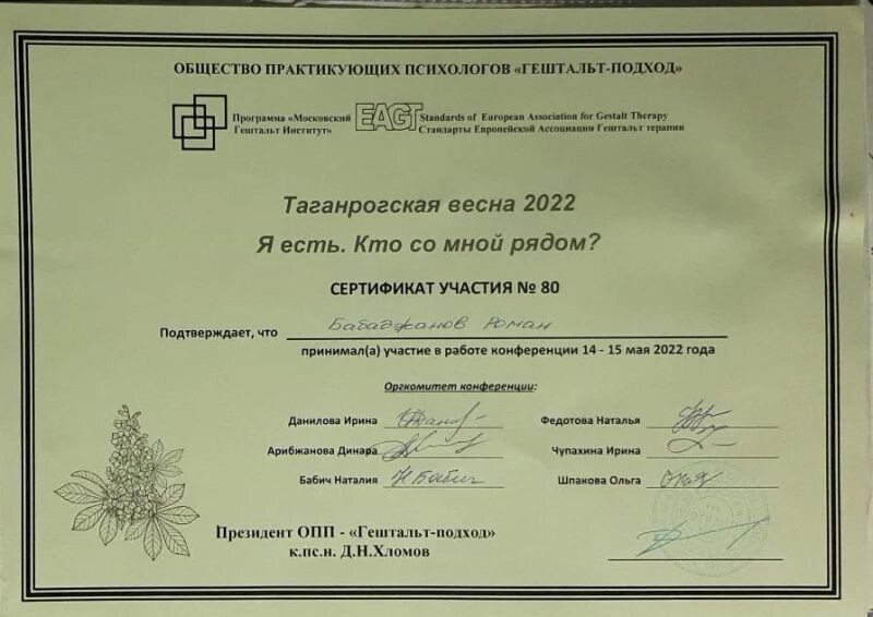 - Общество практикующих психологов «Гештальт-подход», конференция «Таганрогская весна 2022. Я есть. Кто со мной рядом?».