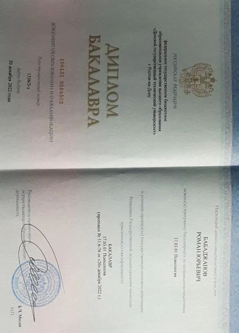 - Федеральное государственное бюджетное образовательное учреждение высшего образования «Донской государственный технический университет», психология, бакалавр, 2018–2022 гг.