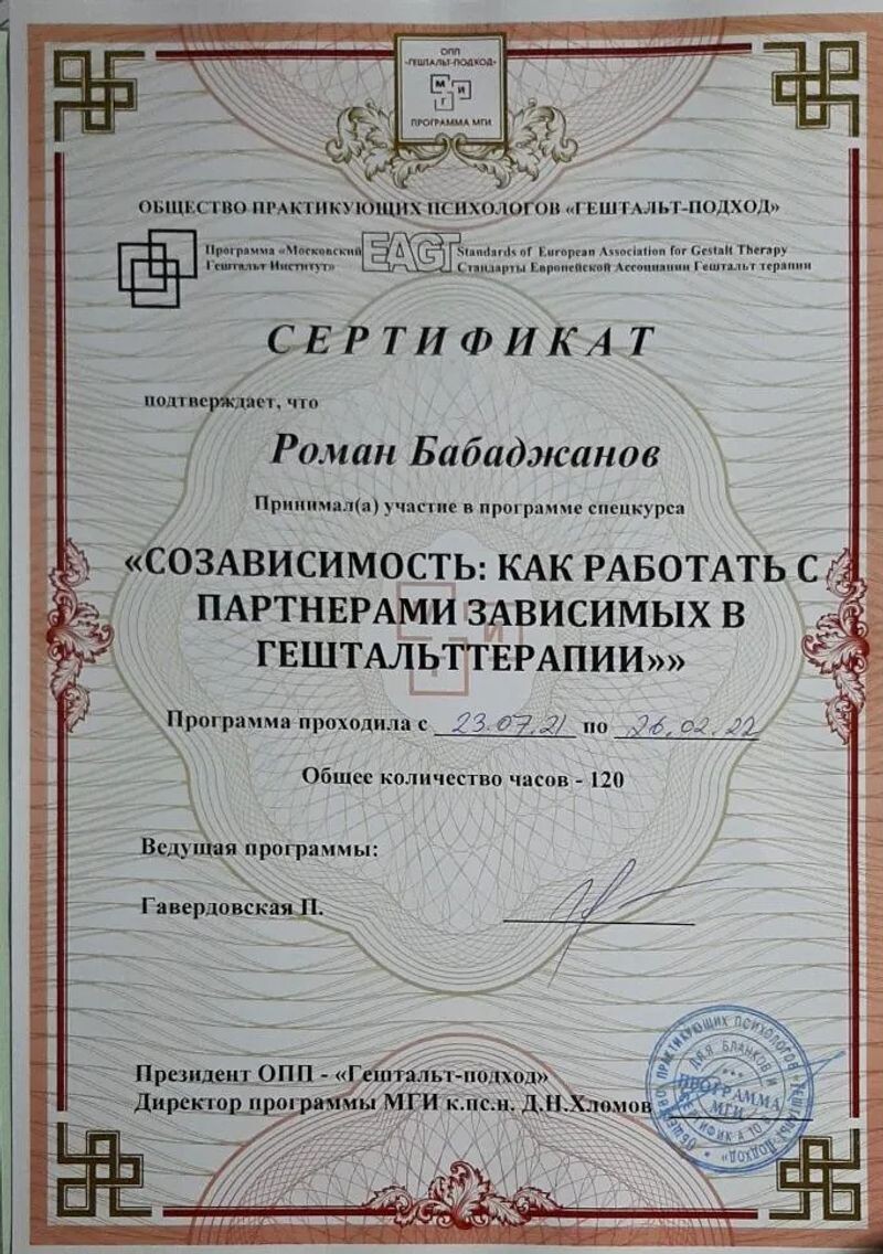 - Московский гештальт институт, курс «Созависимость: как работать с партнерами зависимых в гештальт-терапии», 2021–2022 гг.