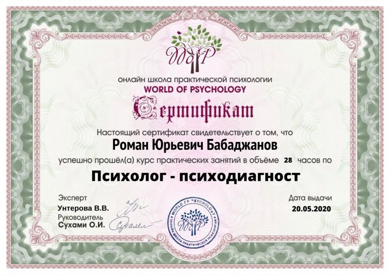 - Онлайн школа практической психологии World of psychology, психолог-психодиагност, 2020 г.