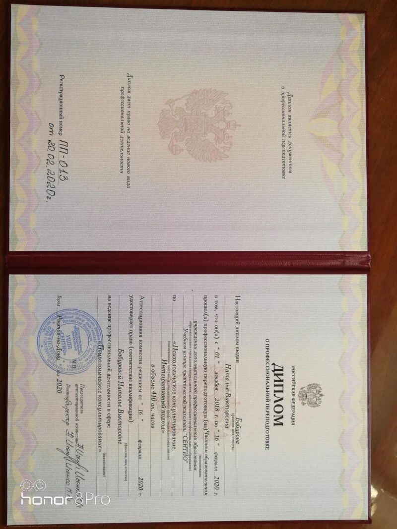 - Учебный центр практической психологии «СЕНТИО», программа «Семейное и детское психологическое консультирование», 2017 г.