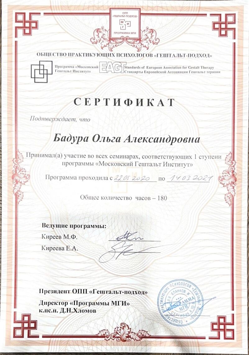 - ОПП «Гештальт-подход», МГИ, программа подготовки гештальт-терапевтов, 1 ступень, 2020–2021 гг.