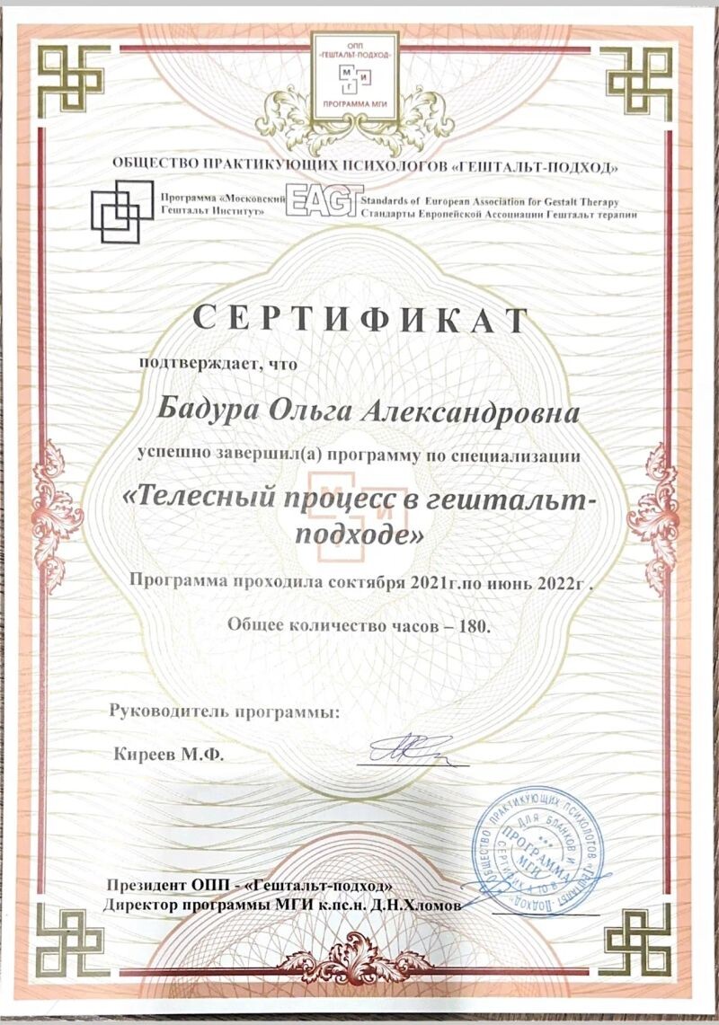 - ОПП «Гештальт-подход», МГИ, программа «Телесный процесс в гештальт-подходе», 2021–2022 гг.