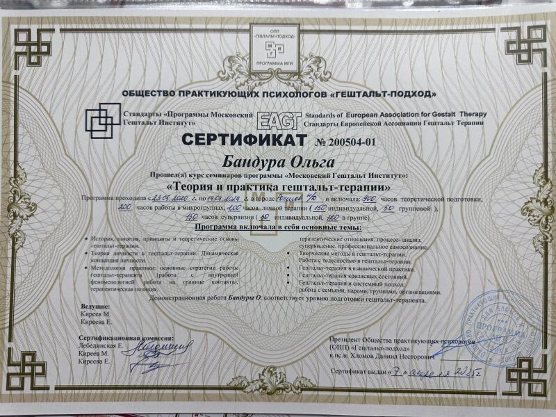 - Московский Гештальт институт, Гештальт, 1212 часов, 2020–2024 гг.