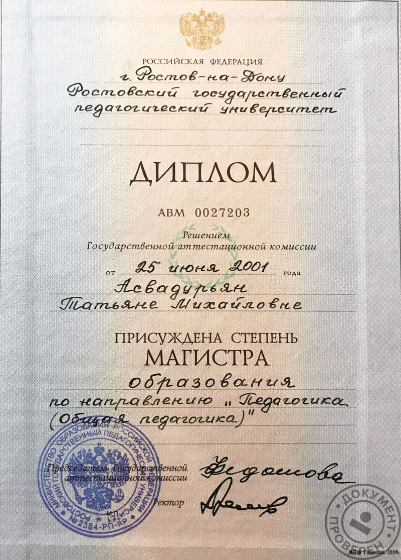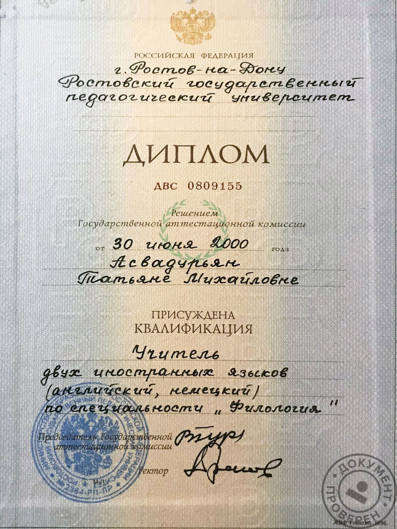 - Ростовский государственный педагогический университет, факультет иностранных языков, квалификация – учитель двух иностранных языков (английского и немецкого) по специальности «филология» (2000 г.); магистр образования по направлению «педагогика (общая педагогика)» (2001 г.).