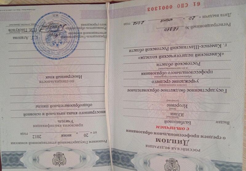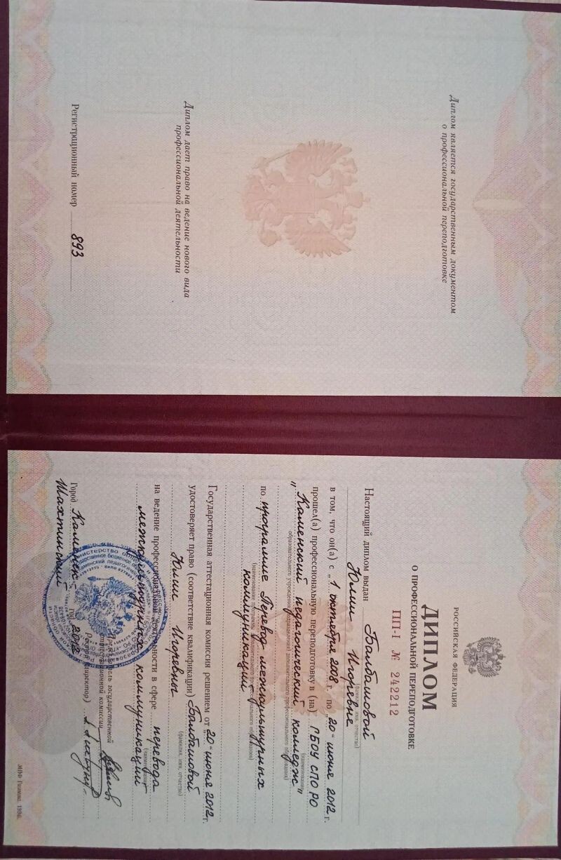 - Каменский педагогический колледж, перевод мнжкультурных коммуникаций, 2008–2012 гг.