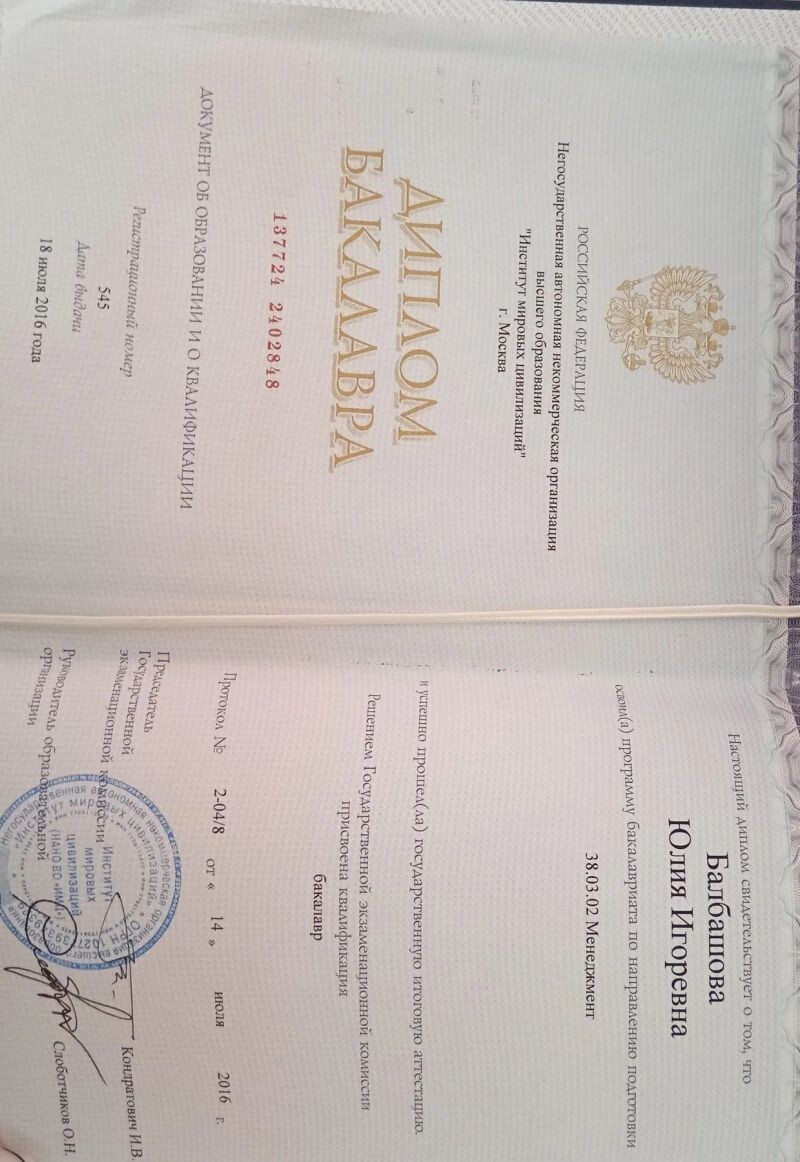 - Институт мировых цивилизаций, менеджмент, 2012–2016 гг.