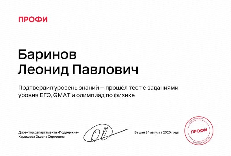 - Подтвердил уровень знаний — Прошёл тест с заданиями уровня ЕГЭ, GMAT и олимпиад по физике (с 2020 г.).