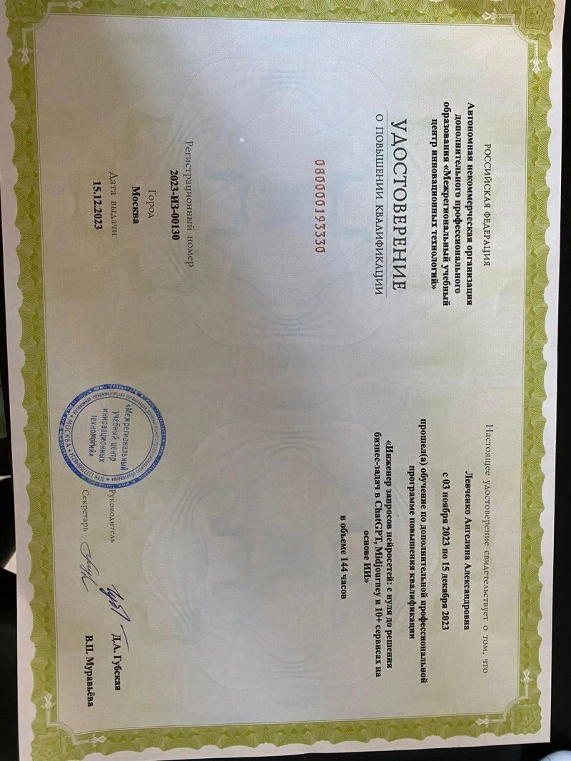 - Межрегиональный учебный центр инновационных технологий, инженер запросов нейросетей: с нуля до решения бизнес-задач в ChatGPT, Midjourney и 10+ сервисах на основе ИИ, 2023 г.
