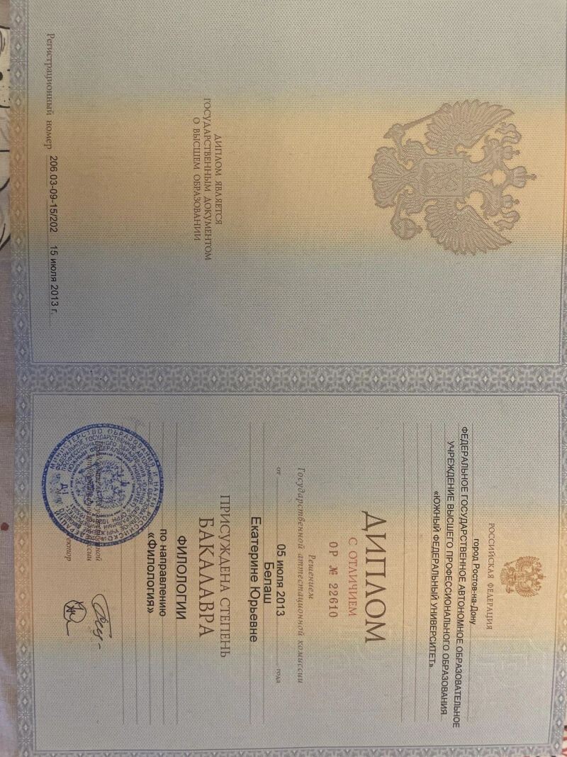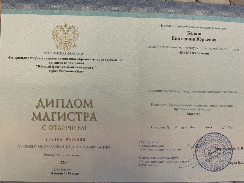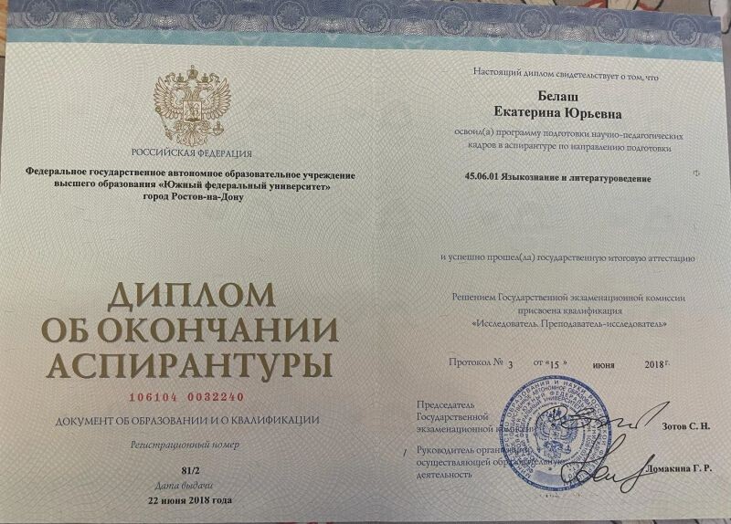 - Южный федеральный университет, программа «Языкознание и литературоведение», 2018 г.