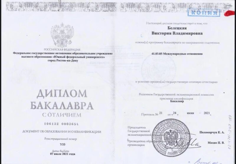 - Южный федеральный университет, г. Ростов-на-Дону, международные отношения, 2017–2021 гг.