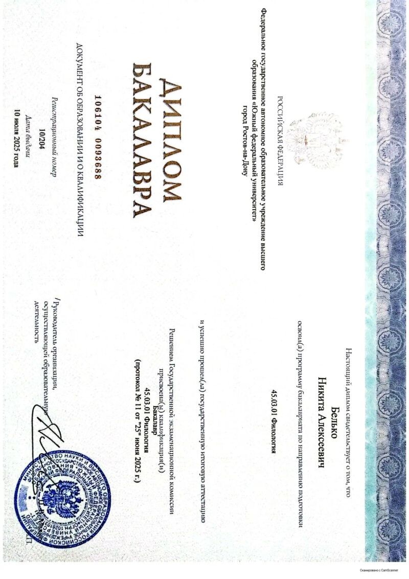 - Южный Федеральный Университет, Институт филологии, журналистики и межкультурной коммуникации (Иностранный языки и перевод в креативных индустриях), Переводчик (с 2025 г.).