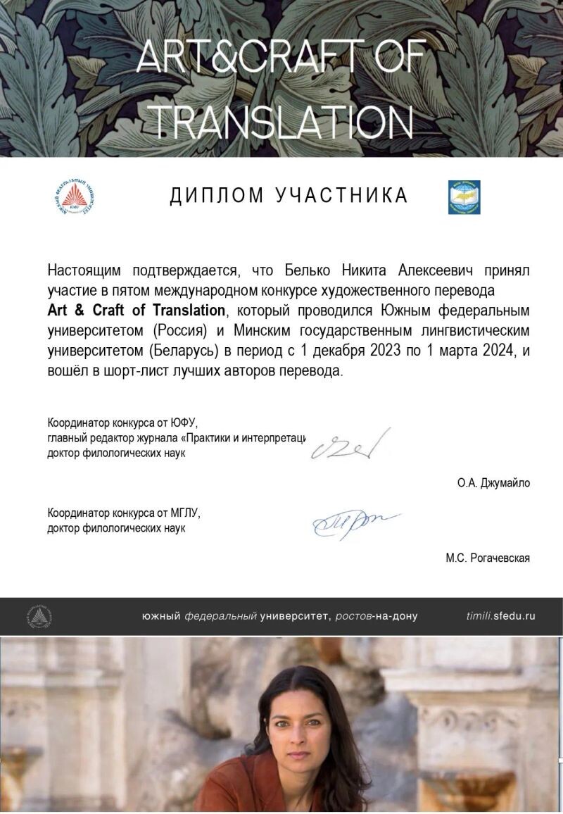 - Диплом участника международного переводческого конкурса Art & Craft. Работа вошла в шортлист 10 лучших переводов (с 2024 г.).