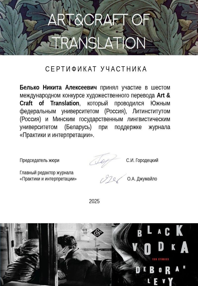 - Диплом участника международного переводческого конкурса Art & Craft (с 2025 г.).