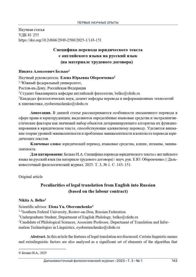 - Публикация научной статьи по теме "Особенности перевода правовых документов с иностранного языка на русский" в Дальневосточном Филологическом Журнале (с 2025 г.).