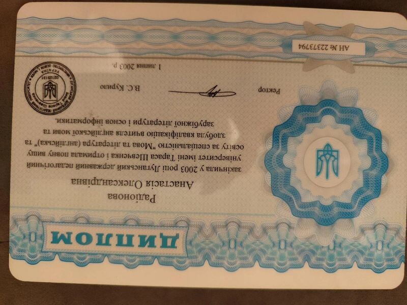 - Луганский государственный педагогический университет имени Т. Шевченко. Факультет романо-германской филологии. Учитель английского языка, 1998–2003 гг.