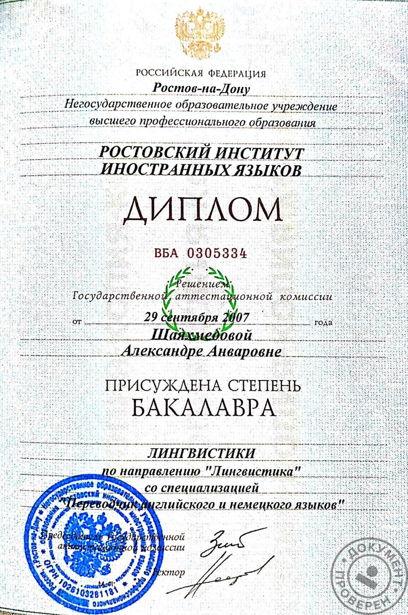 - Окончила Ростовский институт иностранных языков, направление – перевод и переводоведение (английский и немецкий языки), бакалавр лингвистики, 2007 г.