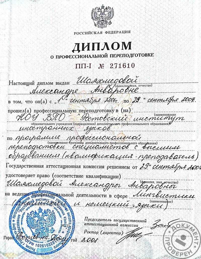 - Диплом о профессиональной переподготовке, квалификация – преподаватель английского и немецкого языков, 2007 г.