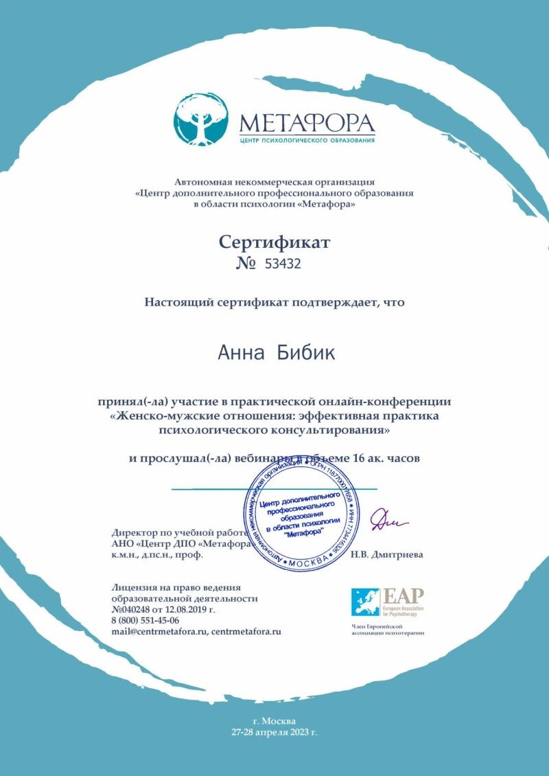 - Метафора, вебинар «Женско-мужские отношения: эффективная практика психологического консультирования», 2023 г.