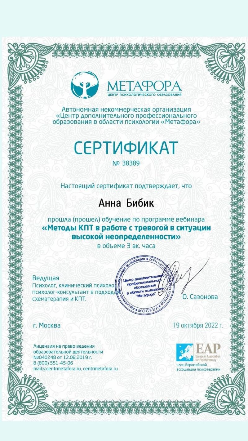 - Метафора, программа «Методы КПТ в работе с тревогой в ситуации высокой неопределённости», 2022 г.