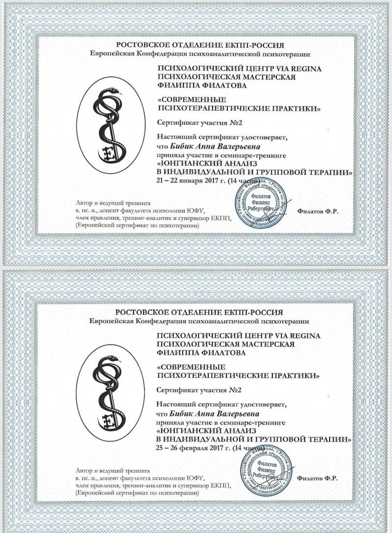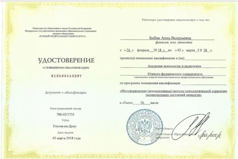 - Южный федеральный университет, программа «Ассоциативные методы психологической коррекции эмоциональных состояний личности», 2018 г.