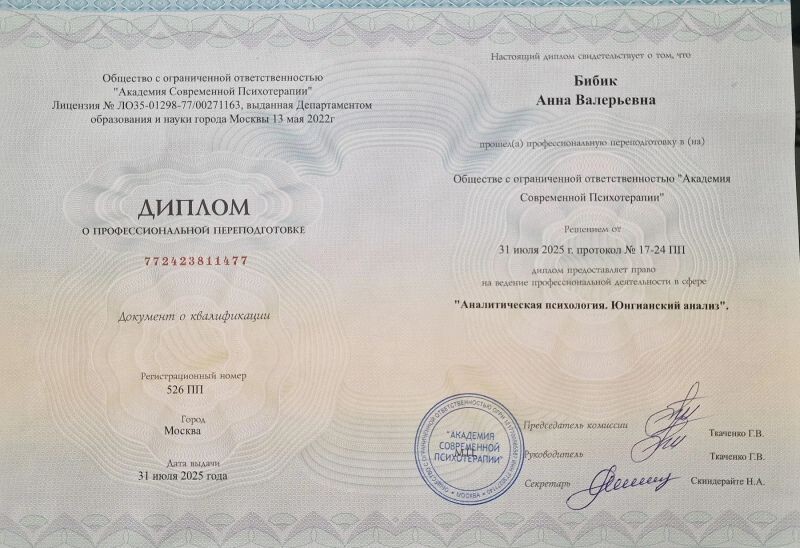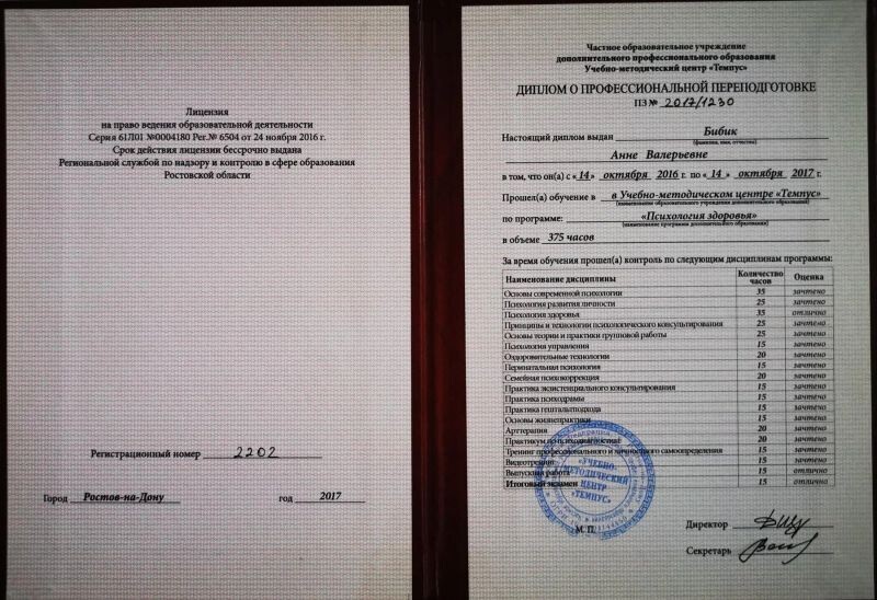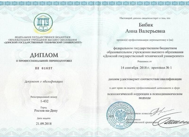 - Донской государственный технический университет, профессиональная переподготовка, право на ведение профессиональной деятельности в сфере психологической коррекции в психодинамическом подходе, 2017–2018 гг.