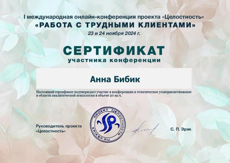 - Проект «Целостность», I Международная онлайн-конференция «Работа с трудными клиентами», 2024 г.