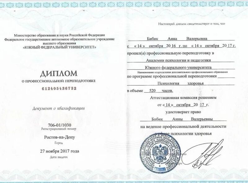 - Южный федеральный университет, программа «Психология здоровья», 2016–2017 гг.