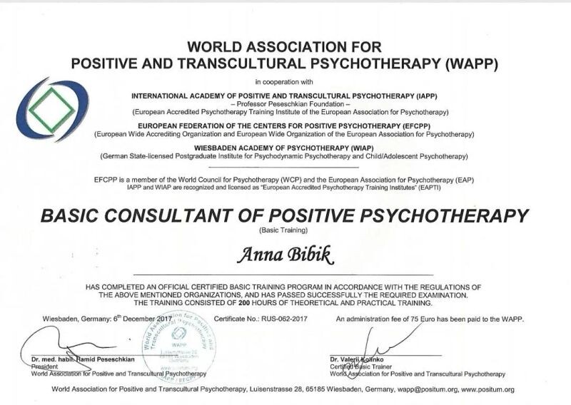 - Wiesbaden Academy of Psychotherapy, Психодинамические подходы, 200 часов, 2017–2017 гг.