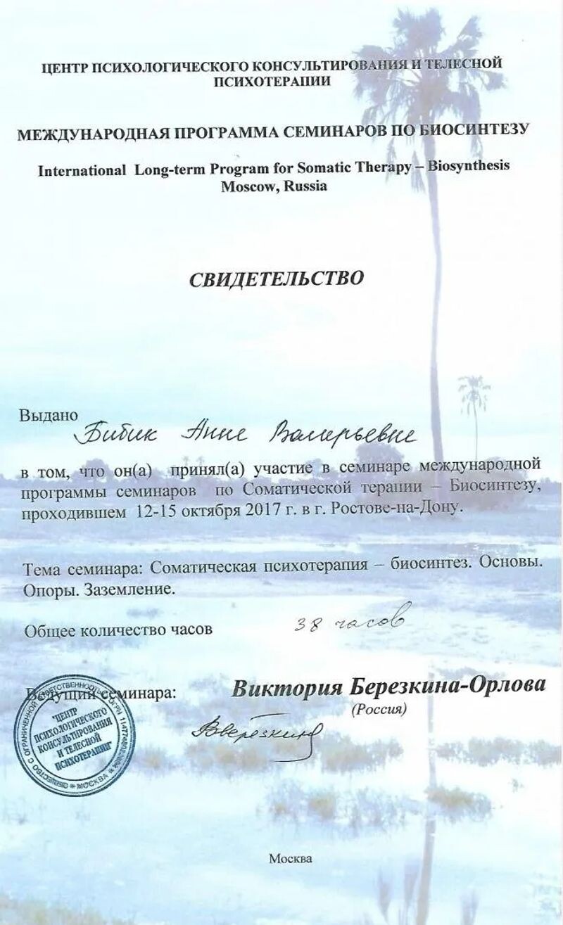 - Центр психологического консультирования и телесной психотерапии , Телесно-ориентированные подходы, 112 часов, 2017–2018 гг.
