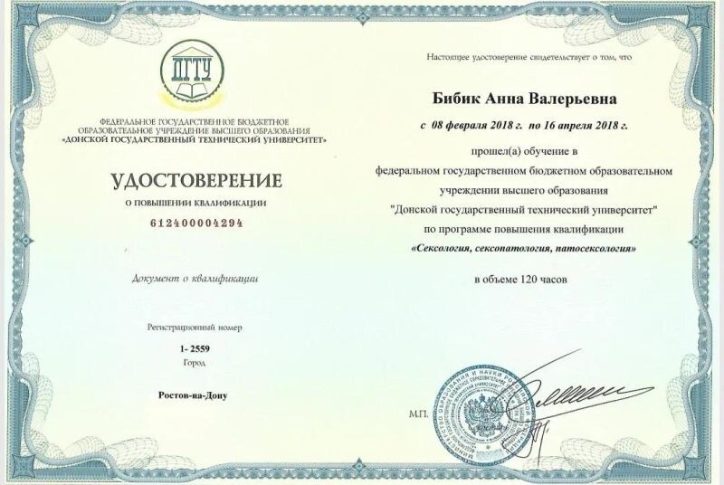 - Донской государственный технический университет, программа «Сексология, сексопатология, патосексология», 2018 г.