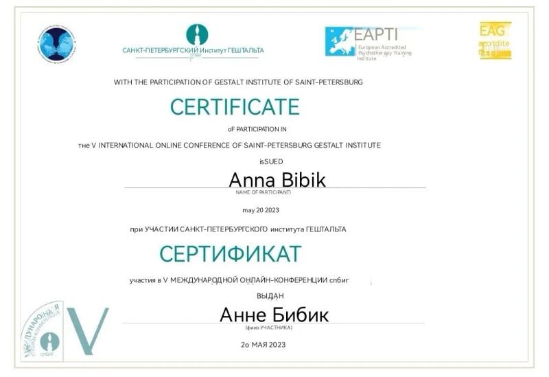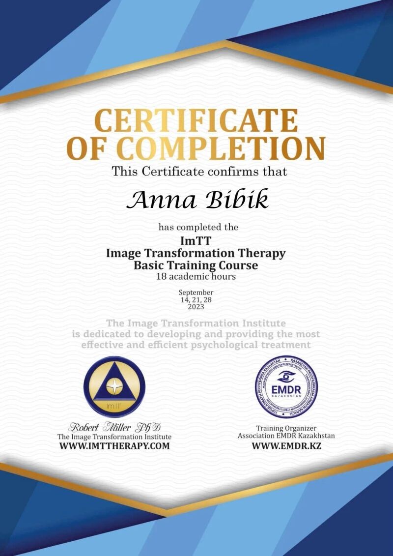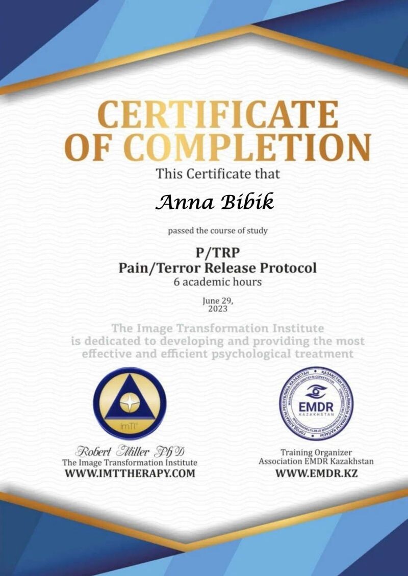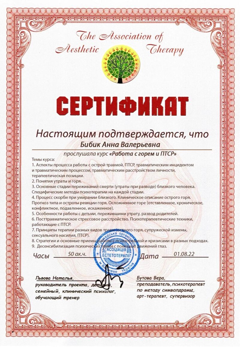 - The Association of Aestetic Therapy, курс «Работа с горем и ПТСР», 50ак. ч, 2022 г.