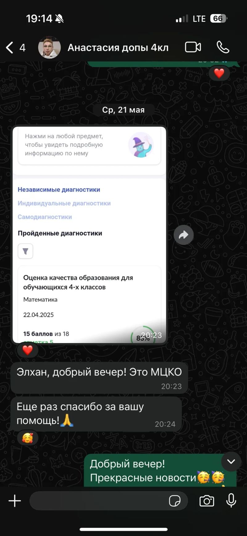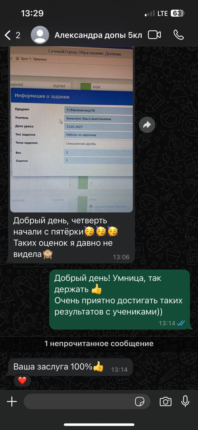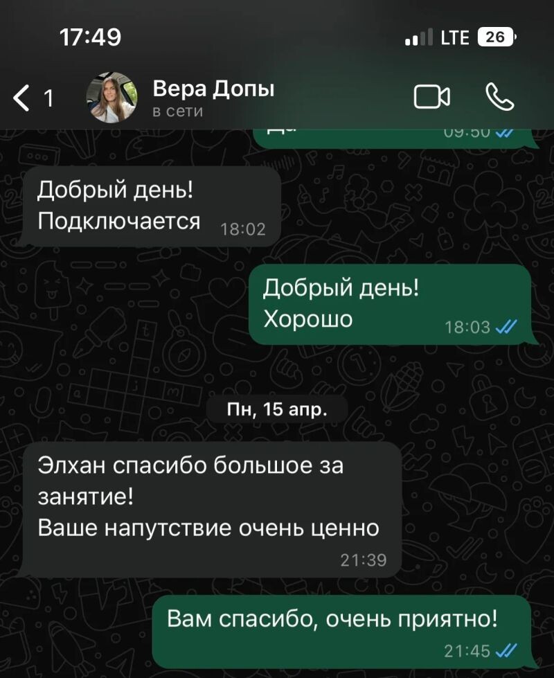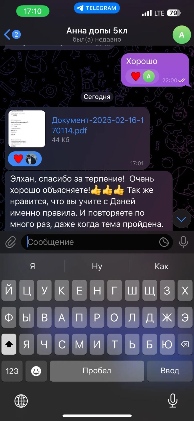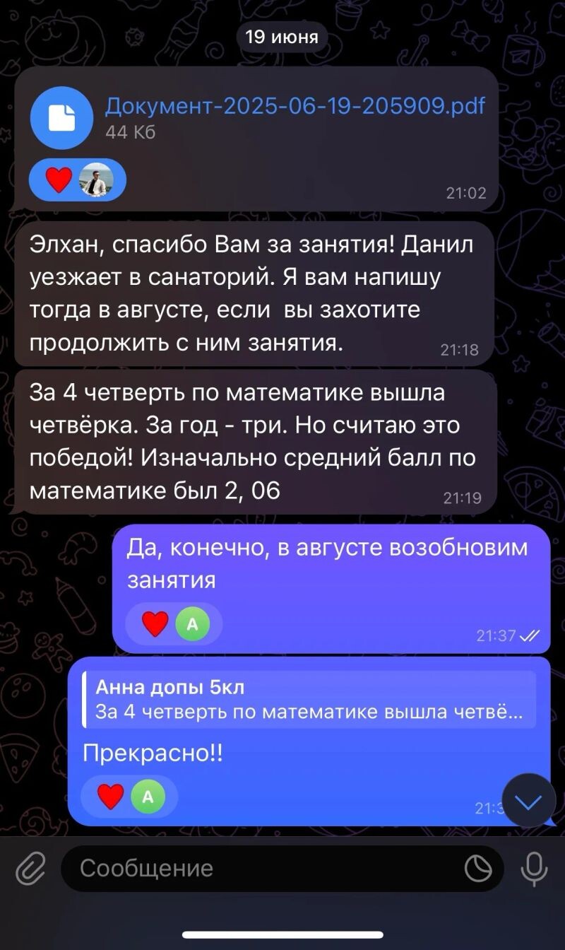 Замечательный репетитор и всем рекомендую! Занимается сын с сентября 2024 года. Ситуация у сына очень сложная. Долго болел ковидом, после чего имеет проблемы с памятью, а с математикой вообще большие проблемы и страх перед этим предметом. Элхан смог найти подход к сыну. Очень доступно объясняет (в объяснениях опускается до уровня сына и Очень терпелив, когда у сына не получается, повторяет и повторяет, никогда не кричит, учит думать, учит как надо рассуждать и не боятся математики, учит как надо отвечать в школе и не боятся учителя). Уроки проходят в дружеской обстановке. У сына наблюдается положительная динамика, оценки улучшились в школе.