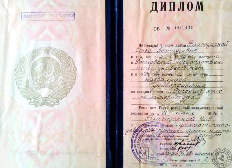 - Ростовский государственный университет (Южный федеральный университет), филологический факультет, квалификация – филолог, преподаватель русского языка и литературы, 1996 г.