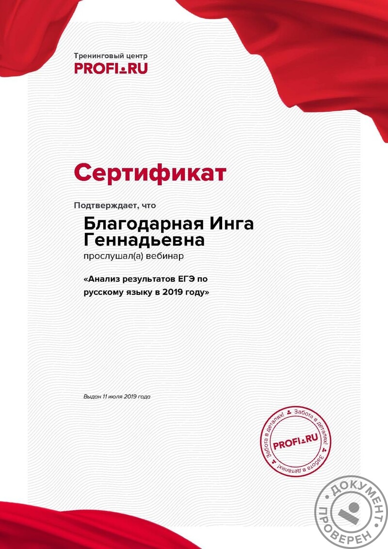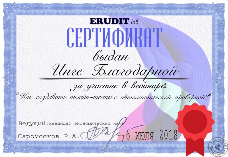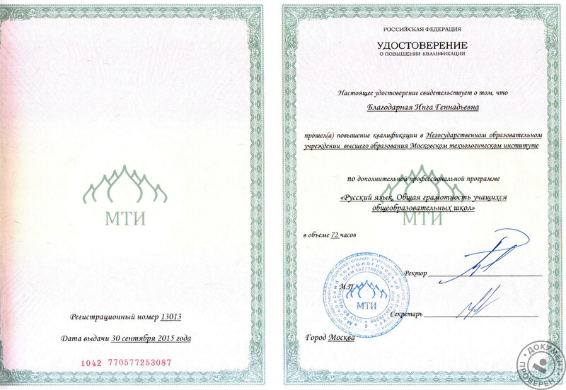 - Курс «Русский язык. Общая грамотность учащихся общеобразовательных школ», Московский технологический институт, 2015 г.