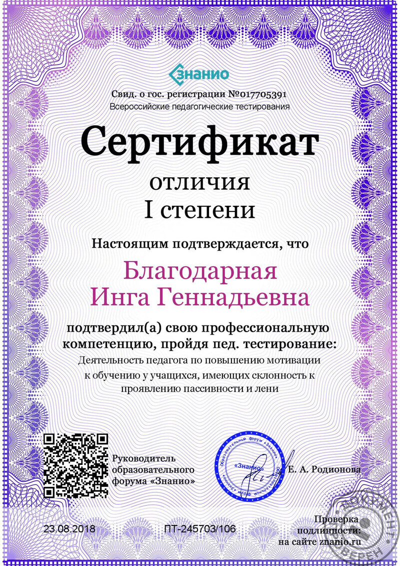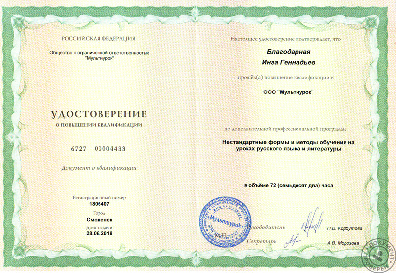 - Курсы «Деятельность педагога по повышению мотивации к обучению у учащихся, имеющих склонность к проявлению пассивности и лени», «Нестандартные формы и методы обучения на уроках русского языка и литературы», «Мультиурок», 2018 г.