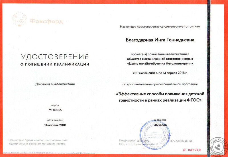 - Курс «Эффективные способы повышения детской грамотности в рамках реализации ФГОС», центр обучения «Нетология», 2018 г.