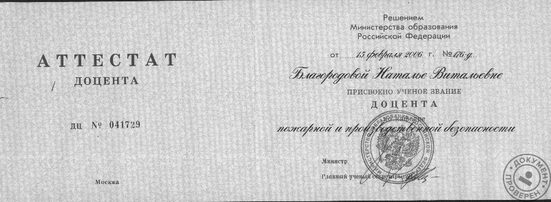 - Присвоено ученое звание доцента кафедры пожарной и производственной безопасности, 2006 г.