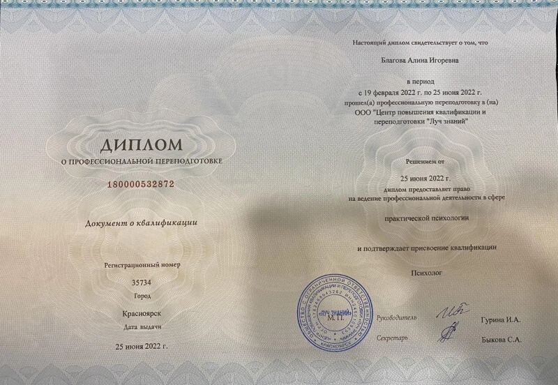 - Центр переподготовки Луч знаний, Психолог, 2022–2022 гг.