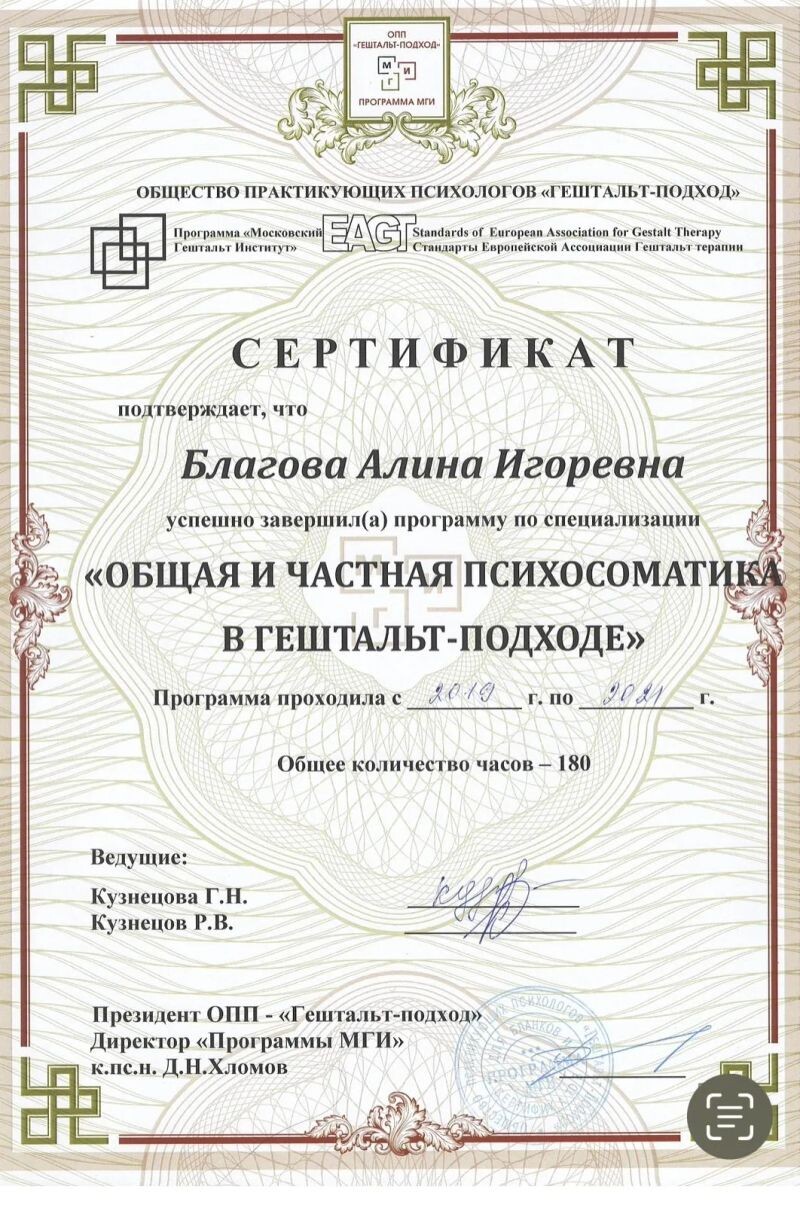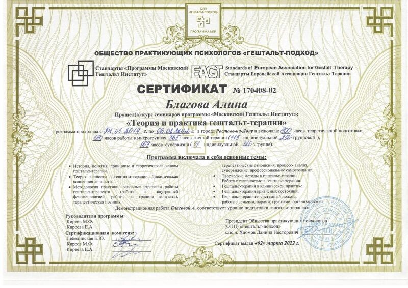 - Московский Гештальт Институт, Гештальт, 800 часов, 2017–2022 гг.